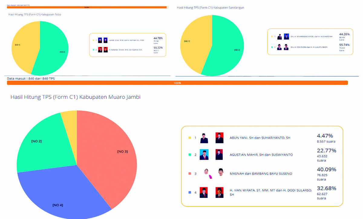 Jambi, AP – Dua calon bupati petahana (incumbent) yang ikut dalam pertarungan di Kabupaten Sarolangun dan Tebo dalam perolehan suara versi hitungan cepat dan hasil scan form C1 KPUD masing-masing, menyusul calon bupati perempuan di Kabupaten Muarojambi masih mengungguli dari pasangan lainya hasil scan form C1 KPUD setempat.