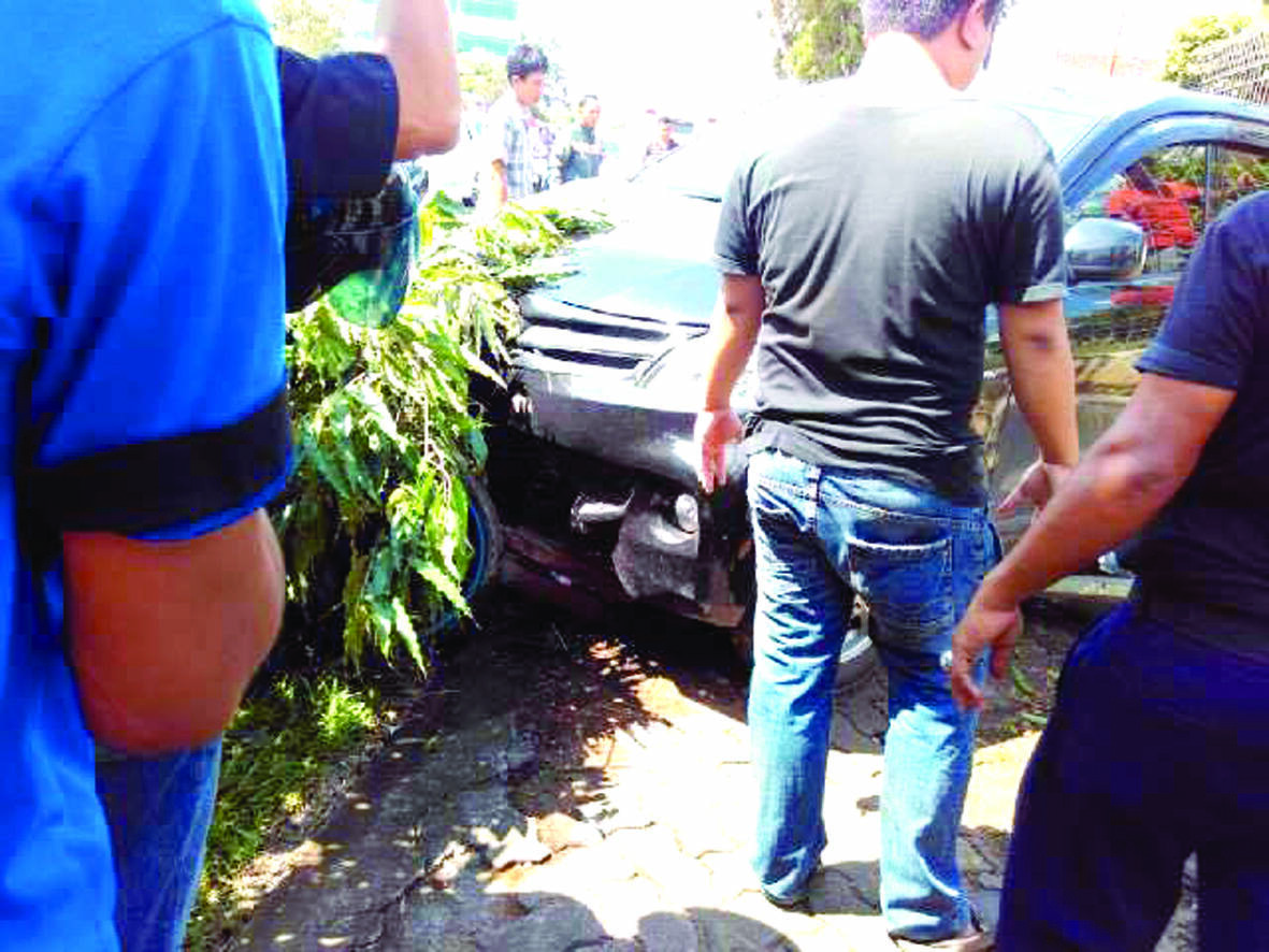 Diduga sopir mengantuk, mobil itu tiba tiba oleng ke kiri menabrak trotoar tepi jalan, lalu menghantam pohon hingga rubuh.