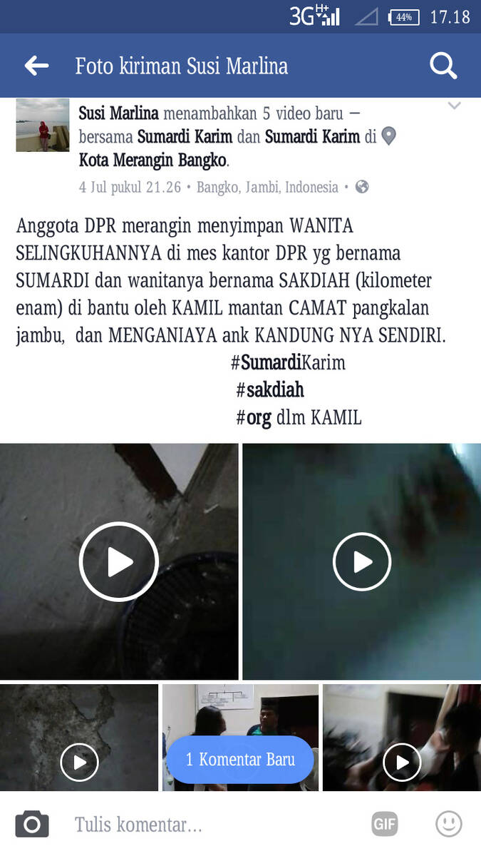 “Anggota DPR merangin menyimpan WANITA SELINGKUHANNYA di Mes kantor DPRD yg bernama SUMARDI dan wanitanya bernama SAKDIAH (kilometer enam) di bantu oleh KAMIL mantan CAMAT pangkalan jambu, dan MENGANIAYA ank KANDUNG NYA SENDIRI.