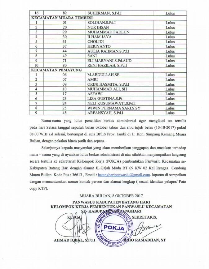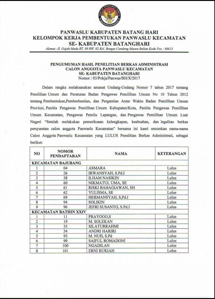 Batanghari,AP- Berdasarkan Surat panitia kelompok kerja(Pokja) Panwaslu Kabupaten Batanghari, Nomor:3/pokja/X/2017, perihal pemgumuman hasil penelitian berkas administrasi calon Panwaslu Kecamatan dalam Kabupaten Batanghari pada pemilihan umum legislatif,Presiden dan wakil Presiden 2019.Berikut nama nama calon anggota panwaslu Kecamatan yang dinyatakan lolos asministrasi