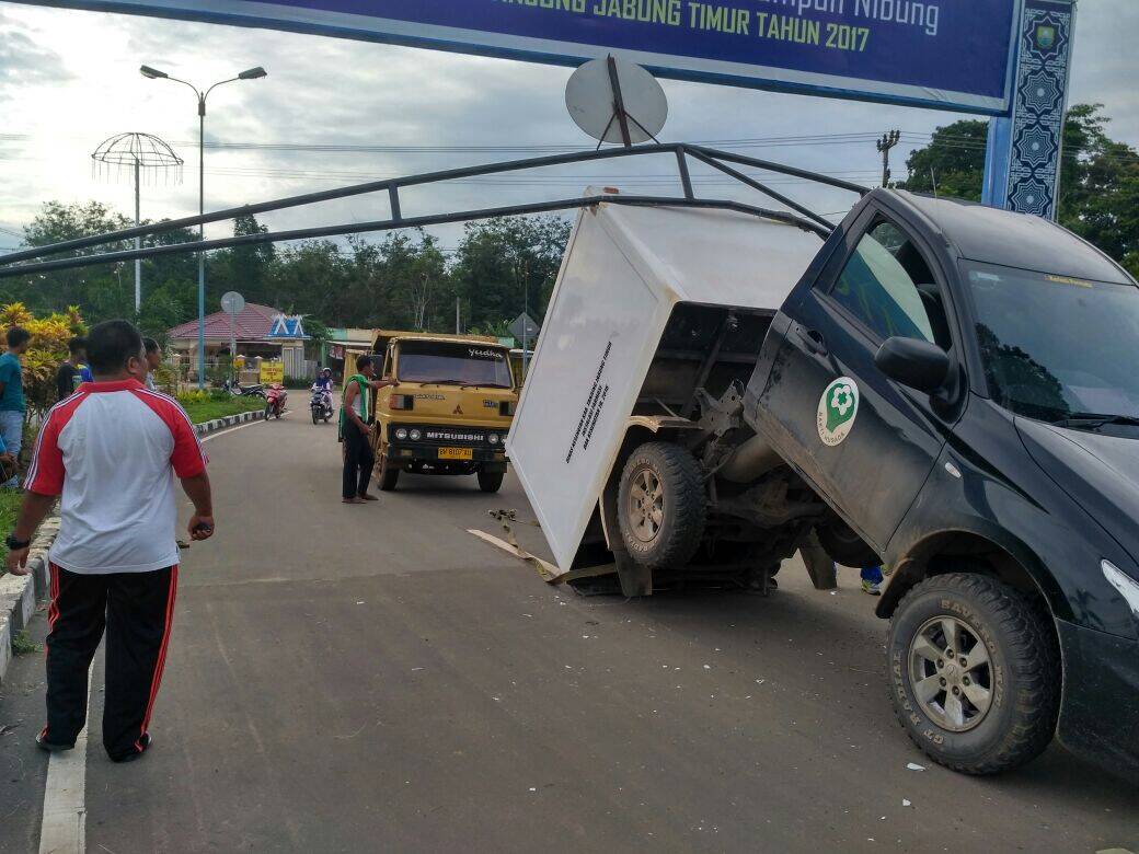 Muarasabak, AP – Minggu (12/11) sekira pukul 13.40 WIB, sebuah mobil Box Strada Triton dengan nomor Polisi BH 2887 YX milik Intansi Farmasi Dinas Kesehatan Kabupaten Tanjung Jabung Timur (Tanjabtim) menabrak palang tiang Portal simpang empat Keramas, Kelurahan Talang Babat, Kecamatan Muara Sabak Barat. Akibat kejadian ini, satu unit mobil milik farmasi rusak, tiang penyangga gapura lepas serta palang tengah gapura lepas dan patah.