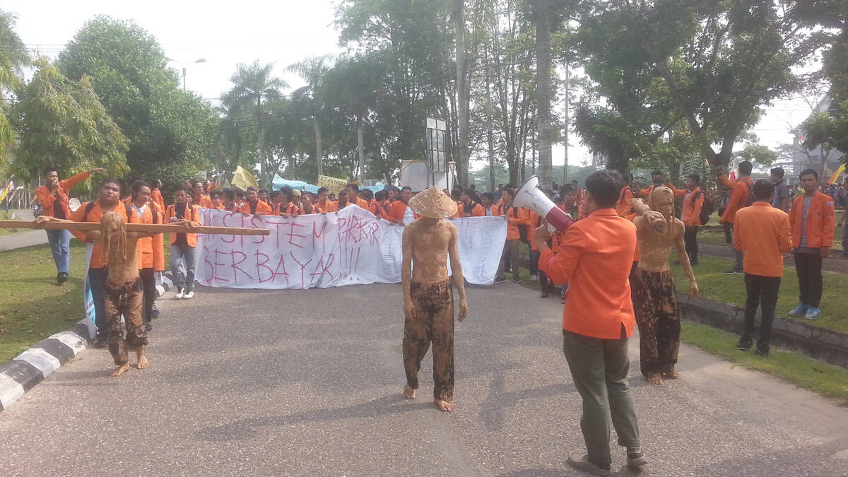 “Tolong Pak Rektor hadir di mimbar ini, jangan sampai nanti mahasiswa bayar, sementara dosen-dosen tidak,” katanya saat Orasi.
