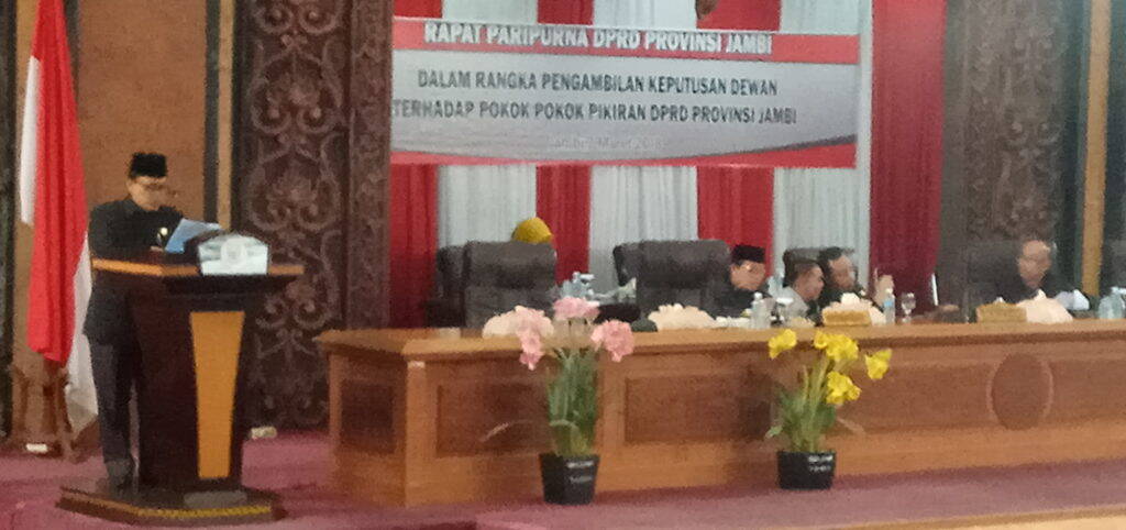Jambi, AP – Dewan Perwakilan Rakyat Daerah (DPRD) Provinsi Jambi menggelar rapat paripurana terkait Penyampaian dan penyerahan pokok-pokok pikiran kepada Pemerintah Provinsi Jambi (Pemprov) Jambi di Gedung DPRD Provinsi Jambi, Rabu (07/03).