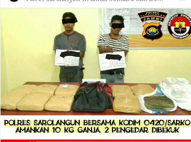 Selanjutnya petugas membawa pelaku dan juga barang buktinya untuk dibawa ke Polres Sarolangun guna proses lebih lanjut.Barang bukti yang berhasil diamankan antara lain,10 (sepuluh) paket besar yang berisi daun, biji dan ranting kering diduga Narkotika jenis Ganja dengan berat keseluruhan ± 10 (sepuluh) kilogram,1 (satu) buah karung besar,1 (satu) buah tas besar, 1 (satu) unit telepon genggam merek ALDO warna putih dan 1 (satu) unit telepon genggam merek SAMSUNG warna hitam.