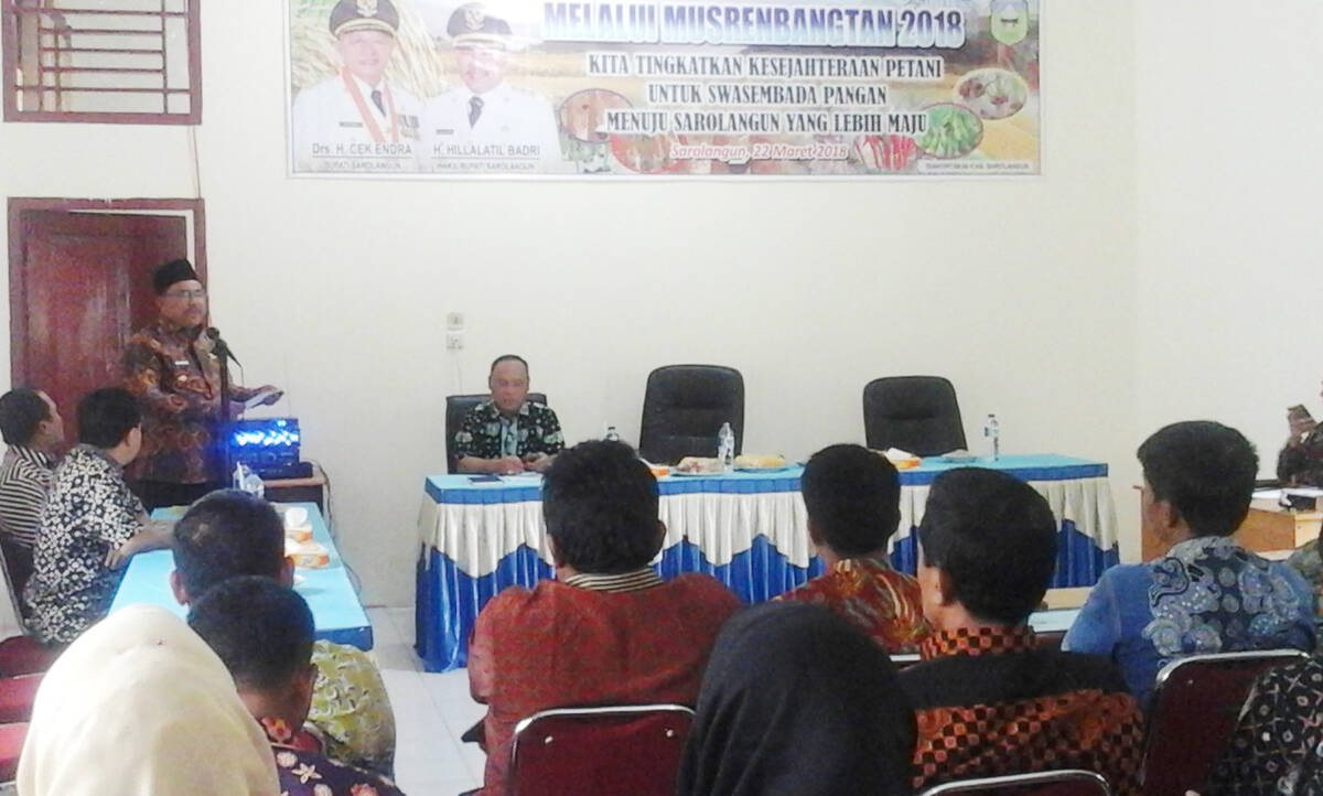 Kepala Dinas Tanaman Pangan Holtikultura dan Perkebunan (TPHP) Kabupaten Sarolangun,Ir Joko Susilo mengatakan,Musrenbangtan tahun 2018 bertujuan untuk memadukan antara proram diluar dan dalam sektor pertanian,mensinergikan program/kegiatan sektor pertanian sehingga rumusan sesuai kebutuhan masyarakat dan rencana program pembangunan.pertanian di Kabupten Sarolangun 2019 dapat di himpun menjadi suatu rencana program/kegiatan 2019 dengan prioritas peningkatan dan kuantitas untuk komoditas padi,jagung,kedelai,sapi, cabe dan bawang merah.Dalam acara Musrenbangtan dilaksakan penyampaian usulan dari setiap kecamatan dan Kepala BP3K.Untuk narasumber berasal dari Asisten Ekonomi Pembangunan,Kepala Bapedda,Dinas Tanhortibun .Dinas Perikanan dan peternakan dan dari Ketahana Pangan.cetus Joko