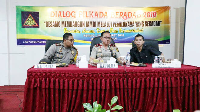 Jambi, AP – Kepala Kepolisian Daerah (Kapolda) Jambi, Brigjen Pol Muchlis AS menghadiri kegiatan acara dialog Pilkada Beradab 2018 di Kabupaten Kerinci, Rabu (28/03) Bertempat di Aula Hotel Arafah Kota Sungai Penuh, Kapolda Jambi Brigjen Pol Muchlis AS Rabu,berdialog dengan berbagai elemen masyarakat dan tim sukses pasangan calon untuk Pilkada Beradab 2018 yang akan di gelar di Kabupaten Kerinci, kata Kabid Humas Polda Jambi, AKBP Kuswahyudi Tresnadi di Jambi.