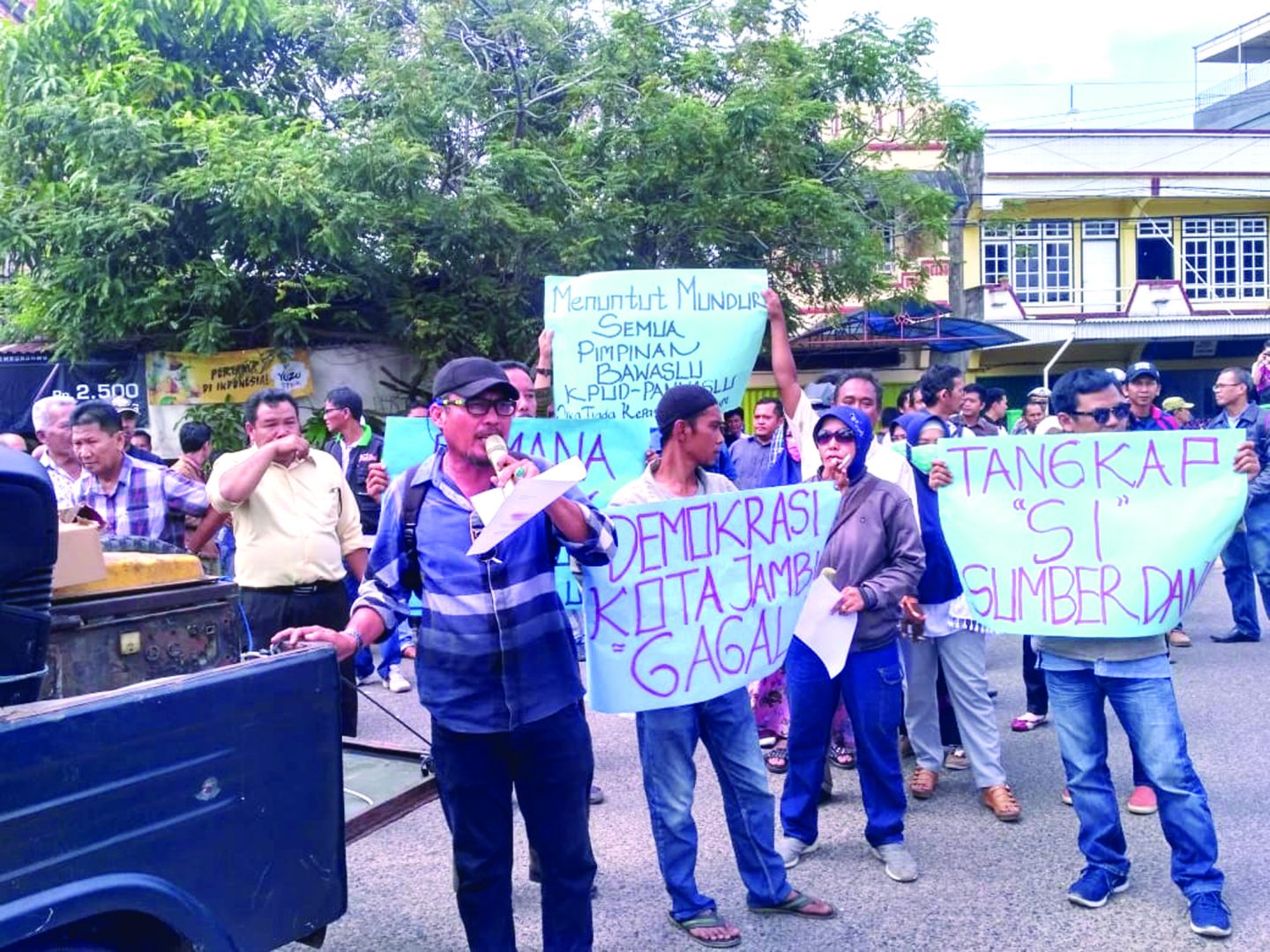 “Kami banyak menemukan kejanggalan, di Pemilihan Walikota Jambi, kami memiliki bukti-bukti,” kata salah satu massa dalam orasinya.