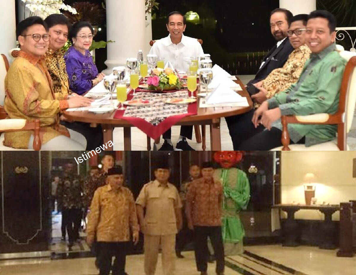 Jakarta, AP – Presiden RI Joko Widodo melakukan santap malam bersama sejumlah ketua umum partai koalisi di Istana Kepresidenan Bogor, Sedangkan Prabowo Subiato melakukan pertemuan dengan sejumlah Pimpinan Partai oposisi dan Persaudaraan Alumni 212 di Hotel Sultan, Jalan Gatot Subroto.