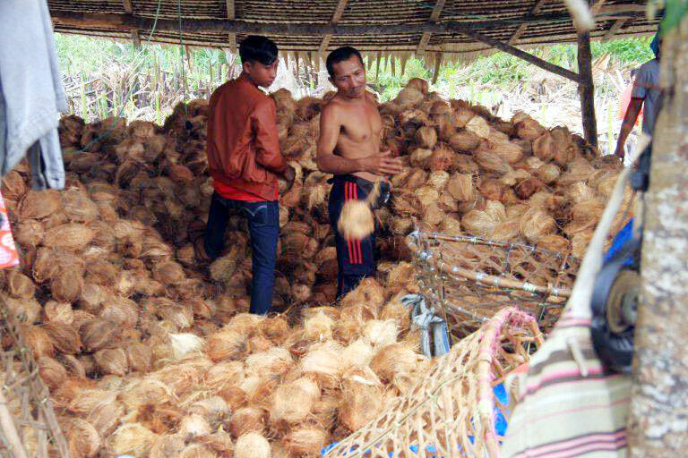 Endang, petani kelapa yang memiliki kebun di Seberang Kota juga mengeluhkan hal sama. Beberapa hari yang lalu dia mengaku menjual kelapa bulat yang telah dikupas sabutnya, seharga Rp 800 per butir.