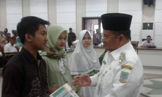 Jambi, AP – Wakil Wali Kota Jambi Maulana menyerahkan secara simbolis bantuan bea siswa dari Badan Amil Zakat Nasional (Baznas) Jambi kepada perwakilan siswa yang berhaK menerima beasiswa tersebut.
