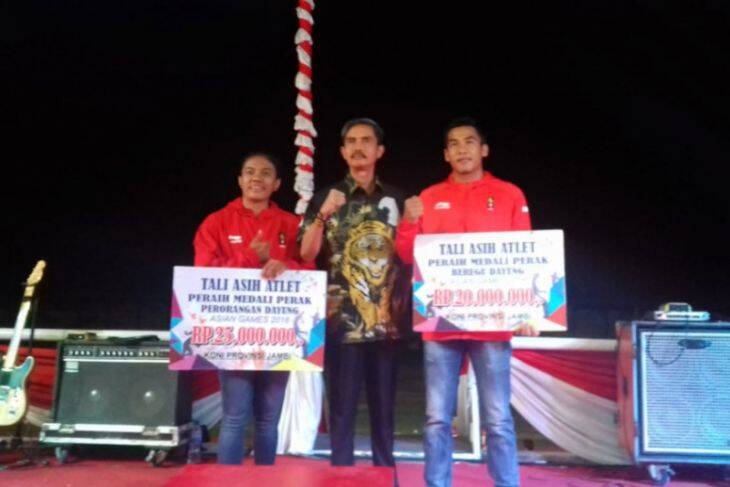 Kedua atlet dayung Jambi itu adalah Riska Andriyani yang meraih medali perak kano nomor ganda putri 500 meter mendapat uang tali asih sebesar Rp25 juta dari KONI Jambi dan Dedi Saputra atlet dayung yang meraih medali perunggu mendapat tali asih Rp20 juta yang langsung diserahkan Ketua Umum KONI Provinsi Jambi, Indra Armendaris.