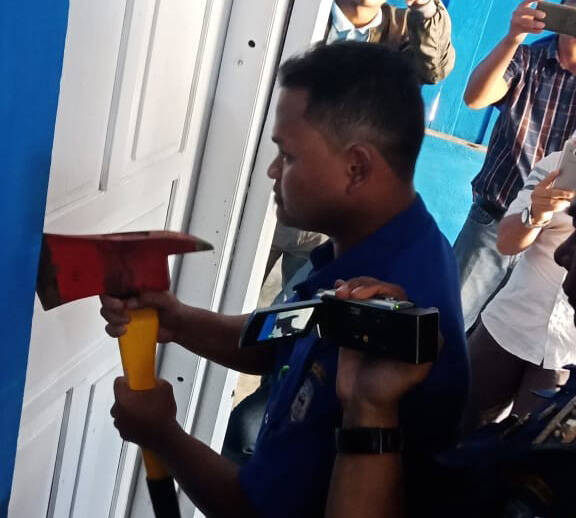 Kamudian pihak Damkar membuka ruangan yang di gembok tersebut menggunakan kapak warna merah, saat menggeledah, petugas kejaksaan menemukan sejumlah dokumen dari laci meja kerja. Selain itu, petugas juga menemukan sobekan klip stiker uang tunai senilai Rp 50 juta.