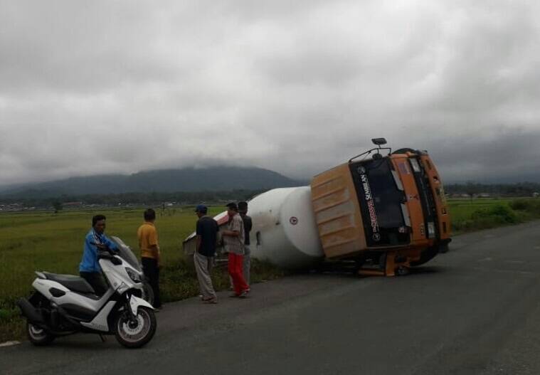 Junaidi, salah seorang warga setempat, mengakui, Sopir yang tidak diketahui identitasnya, ingin berbalik arah, namun saat berbalik arah, mobil Truk Fuso bertuliskan Semen Padang, malah terbalik.