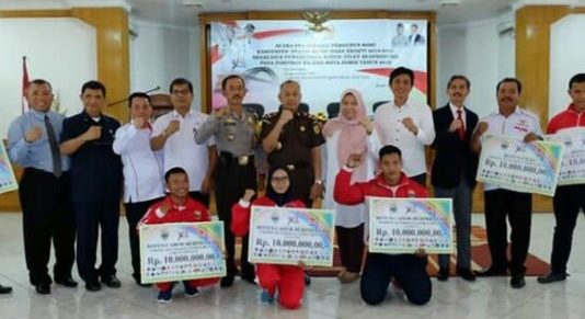 Bupati Muaro Jambi, Hj Masnah Busro dalam sambutnya mengataka, “Saya mengucapkan ribuan terimah kasih, Kepada pengurus KONI dan para atlit Muaro Jambi yang saya banggakan, karena dari perjuangan dan semanggat yang tinggi dari semua pihak, Alhamdulilah Porprov Jambi, tahun 2018, pada hari ini, bonus untuk atlit yang berprestasi dapat dilaksanakan, Atlit peraih medali emas, perorangan mendapat Rp,10 juta, Perak / perorangan Rp, 5 juta. dan Perunggu Rp,2,5 juta, sedangkan bagi para Atlit beregu yang meraih mendali emas mendapatkan 5 juta, Perak beregu, 2,5 juta dan perunggu beregu masing-masing diberi bonus Rp 1,5 juta, bonus ini diberikan  dengan tujuan meransang semanggat para atlit kedepannya lebih baik lagi dari sebelumnya,” ujar bupati.