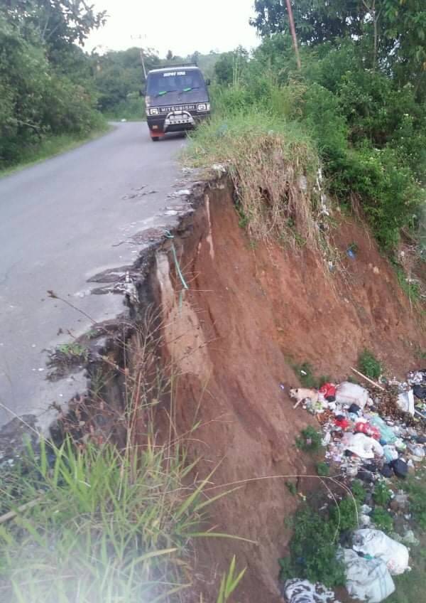 Ruas jalan ini terancam amblas lantaran sebagian badan jalan ambruk akibat longsor, bahkan sebagian aspal pinggir jalan tersebut sudah ada yang longsor.