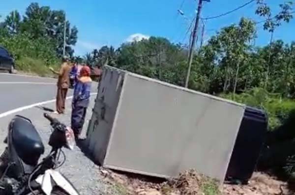 Mobil tersebut terbalik di bahu jalan. Kapolres Tanjab Barat, AKBP Muharman Arta mengatakan mobil boks dengan nomor polisi BH 8003 E berasal dari Tungkal menuju Kota Jambi.
