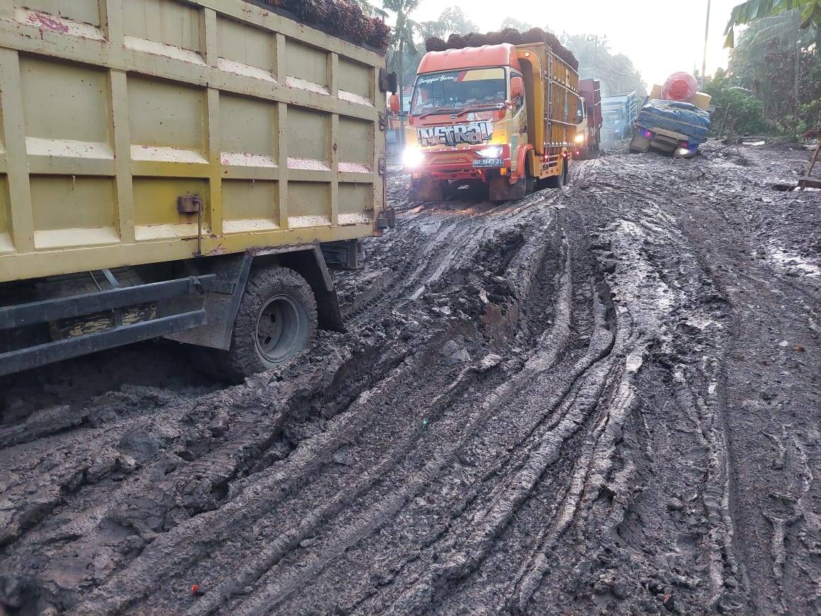 Turunnya hujan membuat kondisi jalan menjadi licin, bertambah hancur dan sulit untuk dilintasi.