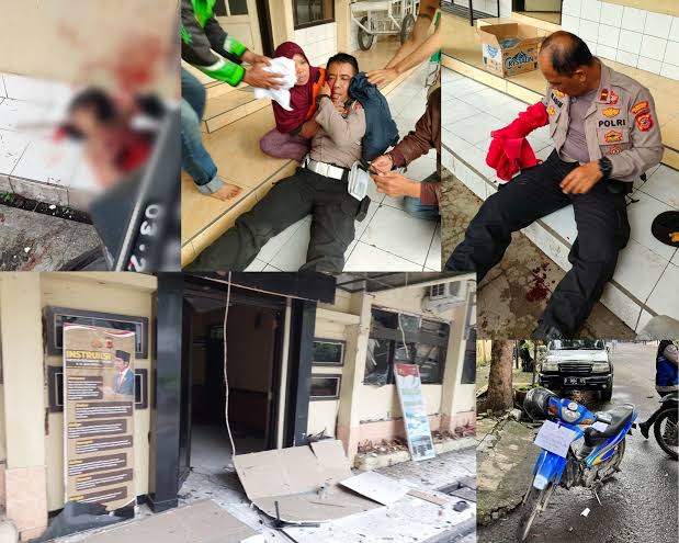 “Ledakan terjadi di bagian dalam, depan pintu masuk Polsek. Korban tiga polisi luka,” ucap Aswin.