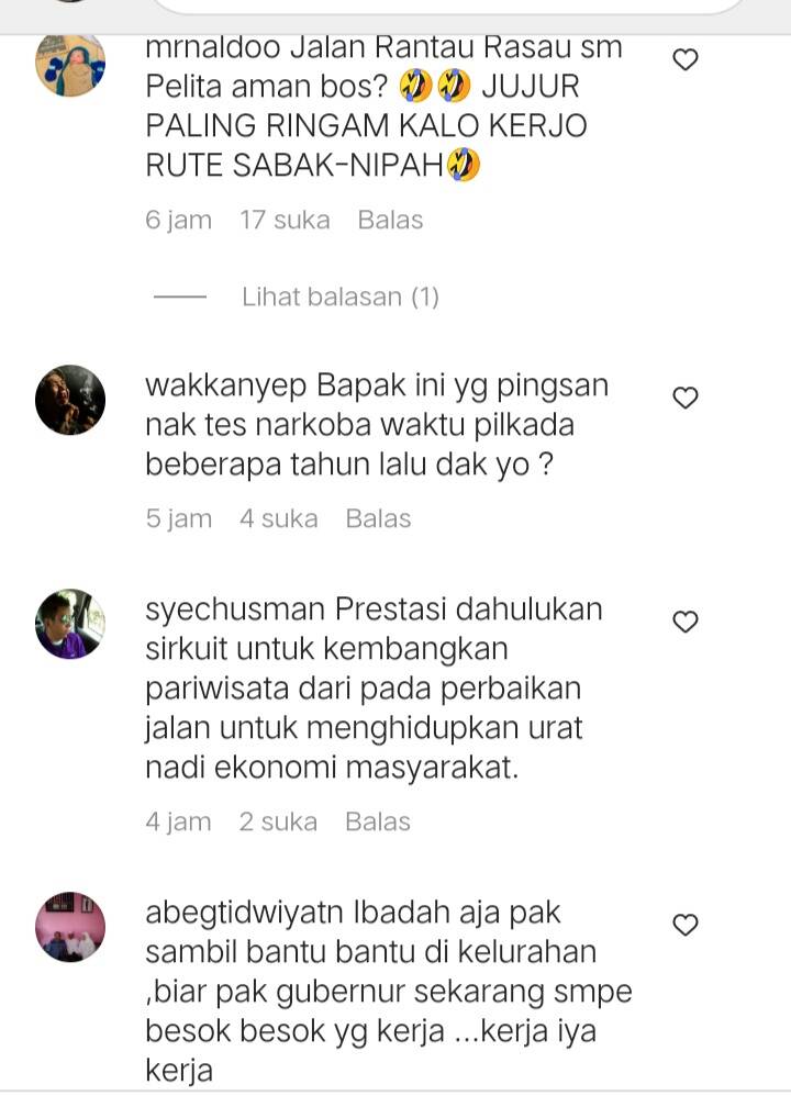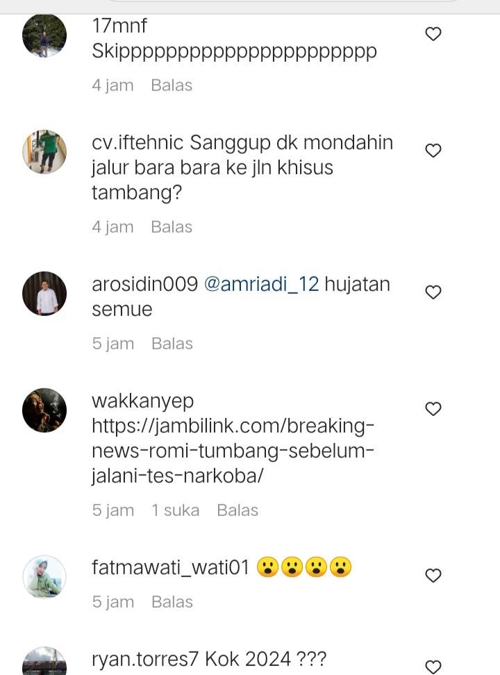 “Urus dulu dah pak jln kabupaten Tanjabtim nya itu banyak masyarakat yg ngeluh tentang jl2 yg banyak rusak parah, jgn nak ngurusin provinsi Jambi nya…,” kata ganda4050.