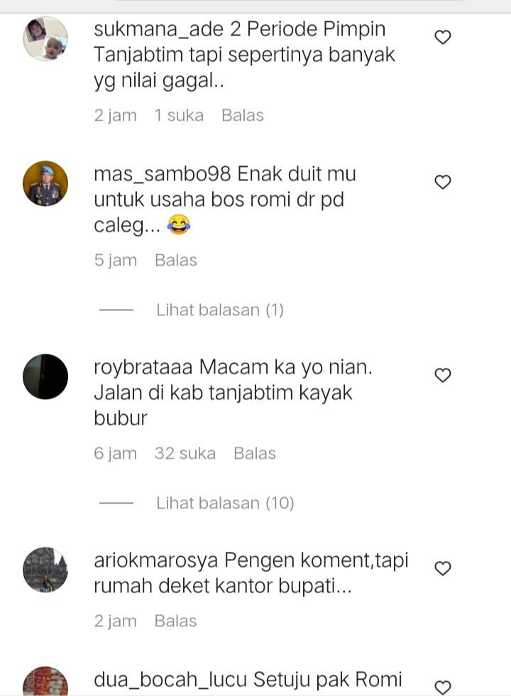Dalam kolom komentar foto tersebut, warganet merasa bahwa Romi tidak memiliki prestasi membangun Tanjungjabung Timur selama dua periode.