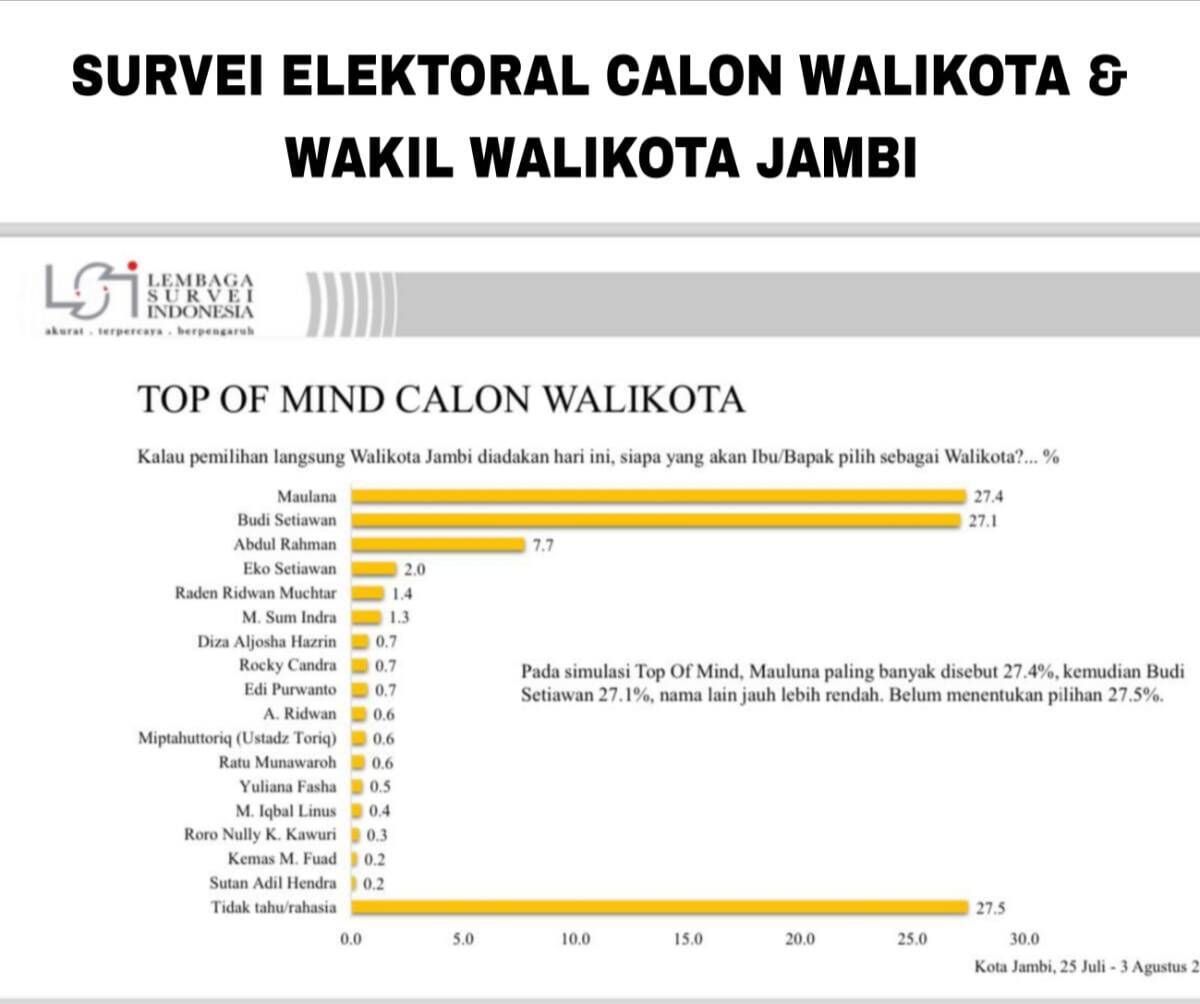 Dalam surveinya di Kota Jambi, nama mantan Wakil Wali Kota Jambi Maulana dan Ketua Umum KONI Provinsi Jambi Budi Setiawan, berada di posisi teratas secara berurutan. Menyusul di bawahnya pada posisi ketiga, H.Abdul Rahman