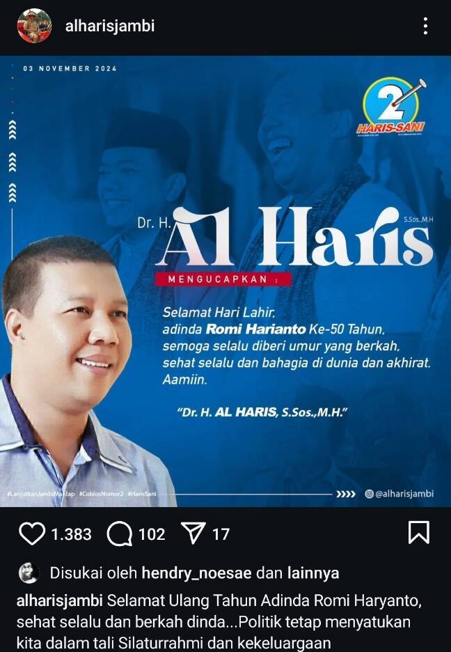 Al Haris menyampaikan ucapan selamat kepada Romi melalui akun Instagramnya, alharisjambi.
