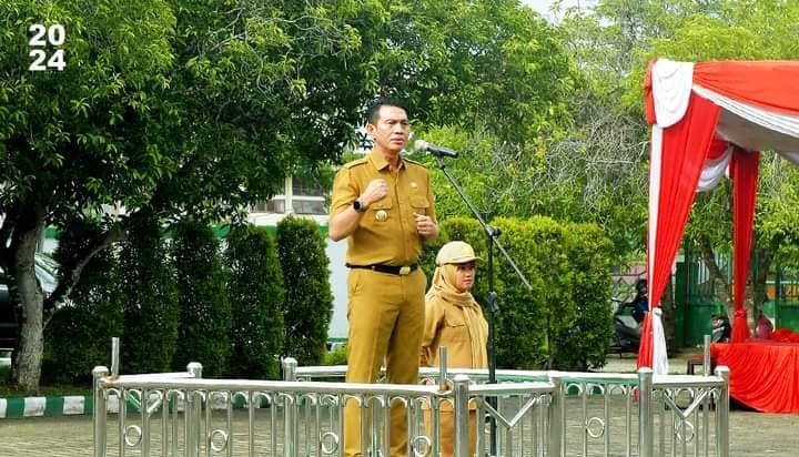 Bulian – Hari pertama masuk kerja, Bupati Batanghari Muhammad Fadhil Arief memimpin upacara setelah melakukan cuti dalam proses Pemilukada Kabupaten Batanghari, Senin (25/11).